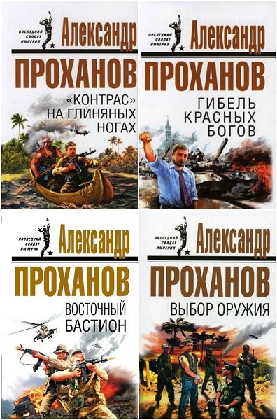 Последний солдат империи - серия 7 книг Александра Проханова о приключениях сотрудника внешней разведки Виктора Белосельцева. Десятилетия свой жизни Проханов посвятил описанию локальных войн мира, в том числе и тех, что велись и ведутся на руинах СССР. Разведчик Белосельцев, военный интеллектуал и провидец, выполняет задание Центра и одновременно пытается понять великую тайну бытия, обрекающую мир то ли на неизбежную гибель, то ли на грядущее, светоносное чудо.