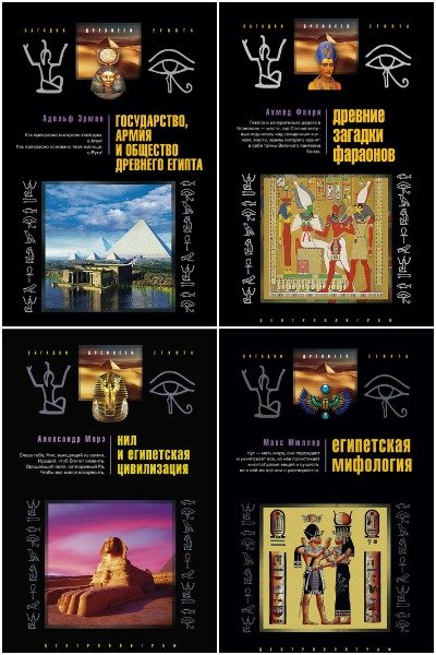 Серия (21 книга) - "Загадки древнего Египта" включает в себя книги о всестороннем изучении одной из самых древних и загадочных цивилизаций Земли - о Древнем Египте. Великая загадочная цивилизация, сформировавшаяся на берегах плодородного, несущего прохладу и жизнь Нила и песках безжалостной, смертоносной, веющей раскаленным зноем Сахары, породила сложную систему богов-животных, обитающих в таинственном мраке вечного хаоса.